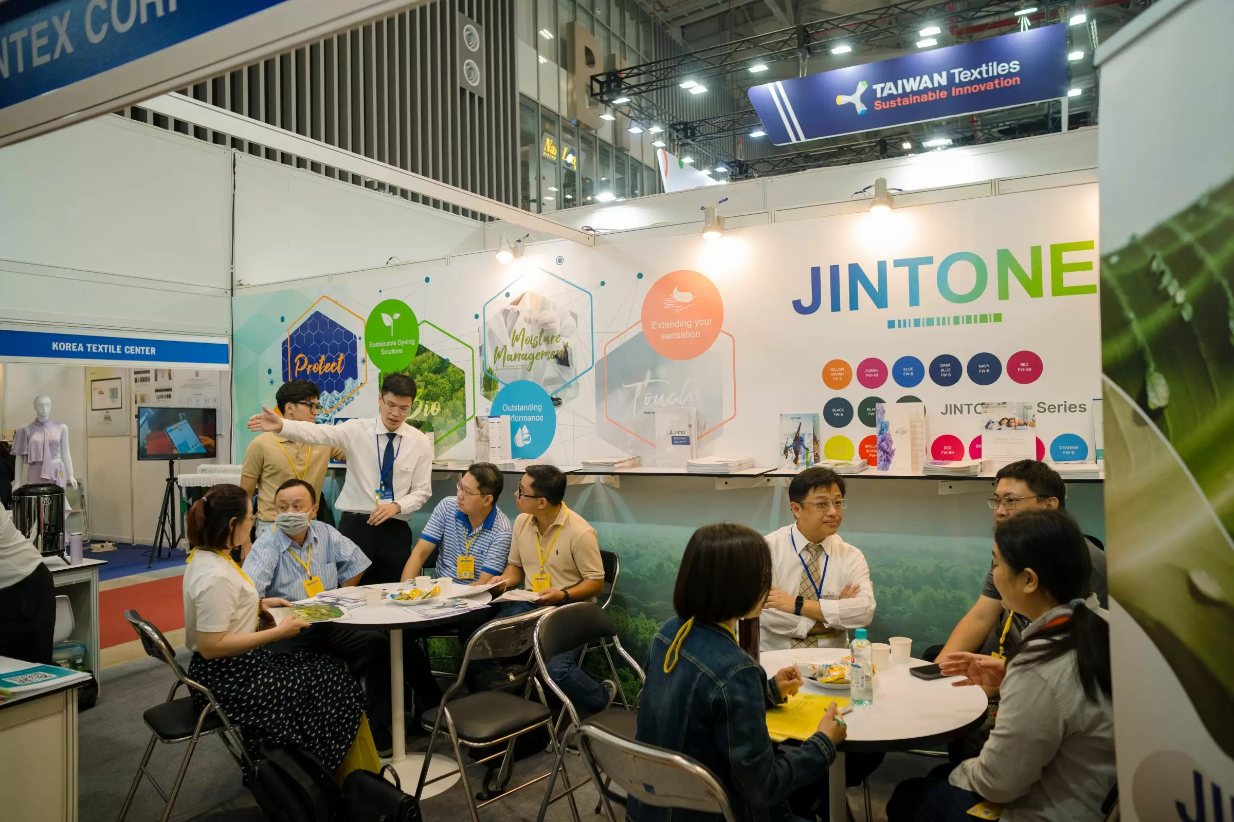 بعد ذلك ، شاركت JINTEX بنشاط في حدث إطلاق المنتج الجديد الذي نظمه اتحاد المنسوجات التايواني في المعرض ، مع التركيز على موضوع الاستدامة ، مع الوظيفة والموضة كموضوعات رئيسية ، وإعادة تقديم F4 والأصباغ.
